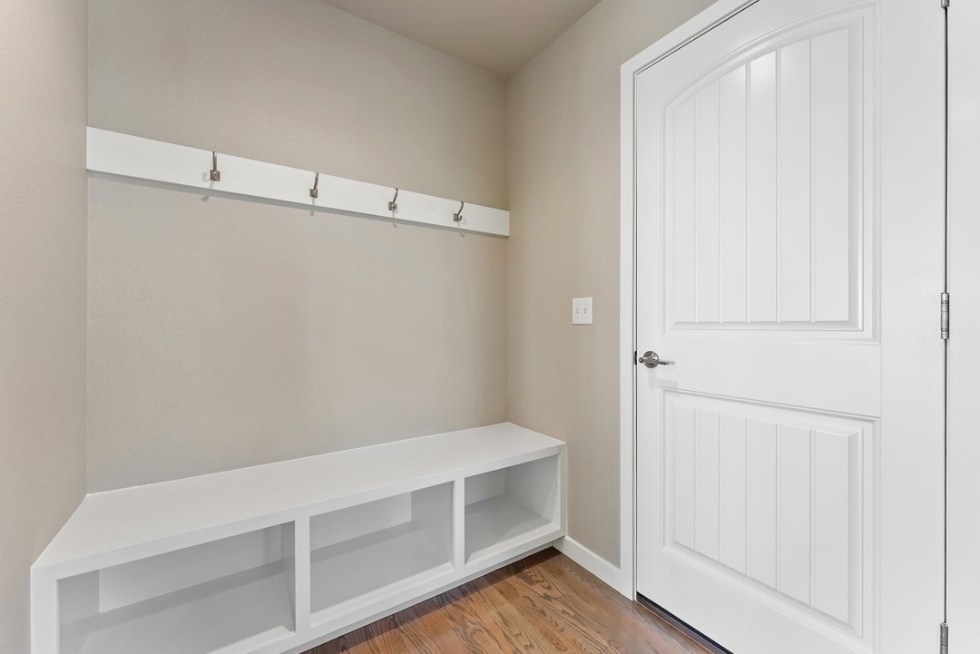 Mudroom with boot bench and a private, centrally located powder room.