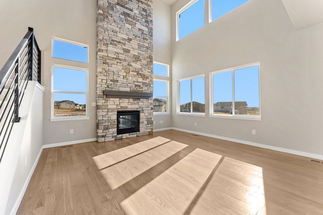 Living room with dramatic two-story ceiling and optional fireplace.